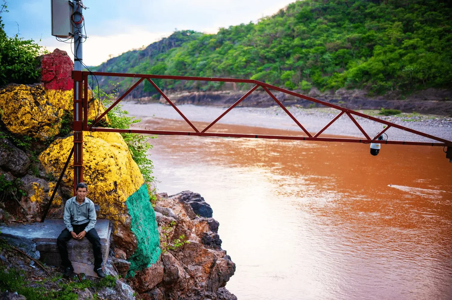 Gustavo Adolfo Ayala, 53, town leader, land local community coordinator in the region of Santa Barbara, Honduras, sits beside river level monitoring equipment. The traffic light system indicates the level of alarm for flooding. Photo: Santiago Billy/Trócaire.